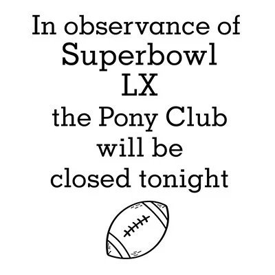 Feb 8 4:00 PM16:00 SUPERBOWL LX Sunday, February 8, 2026 4:00 PM 9:00 PM 16:00 21:00 Hotel Horse (map) Google Calendar ICS View Event →